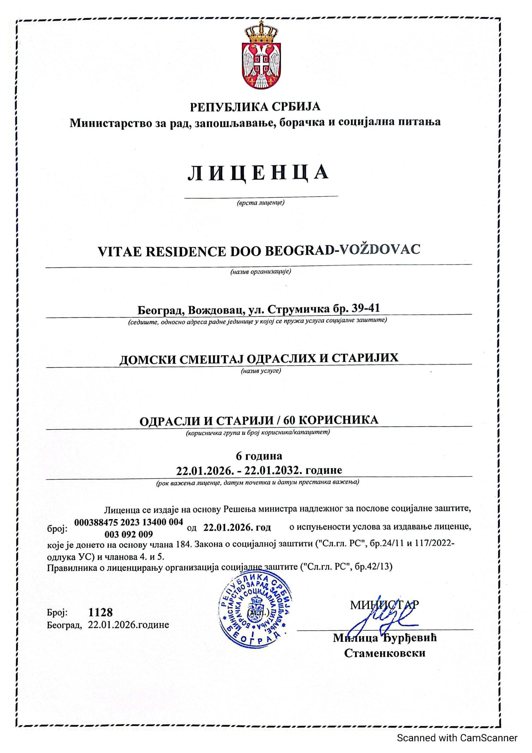 Dom za stare „Vitare Residence“ na osnovu rešenja Ministrstva za Rad, Zapošljavanje, Boračka i Socijalna pitanja dobilo je licencu za rad 22.01.2026. godine. Na osnovu tog rešenja izdata je licenca br 1128.